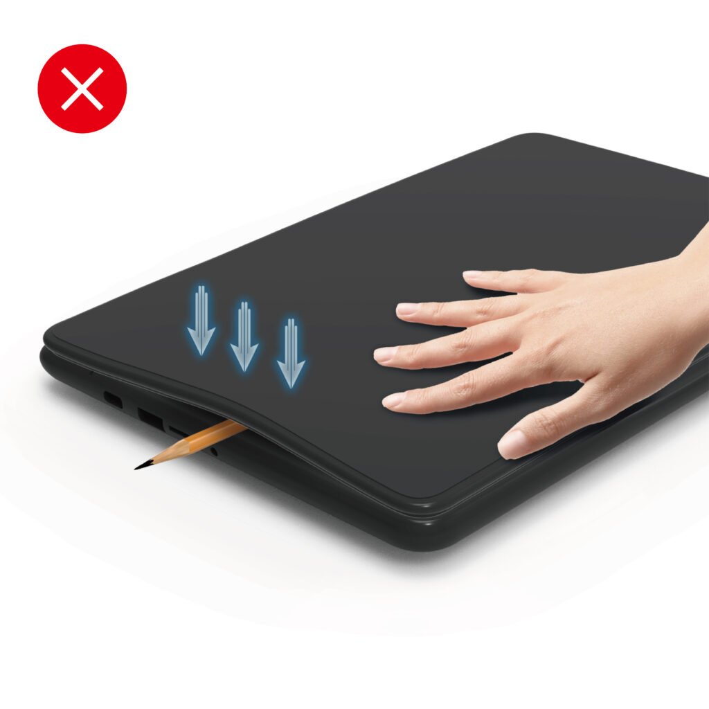 During testing, forcefully closing the device on such items can bend or break the screen.
