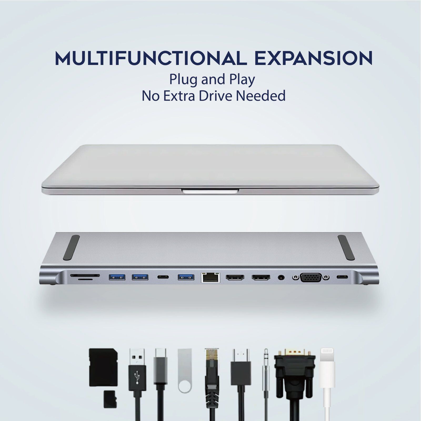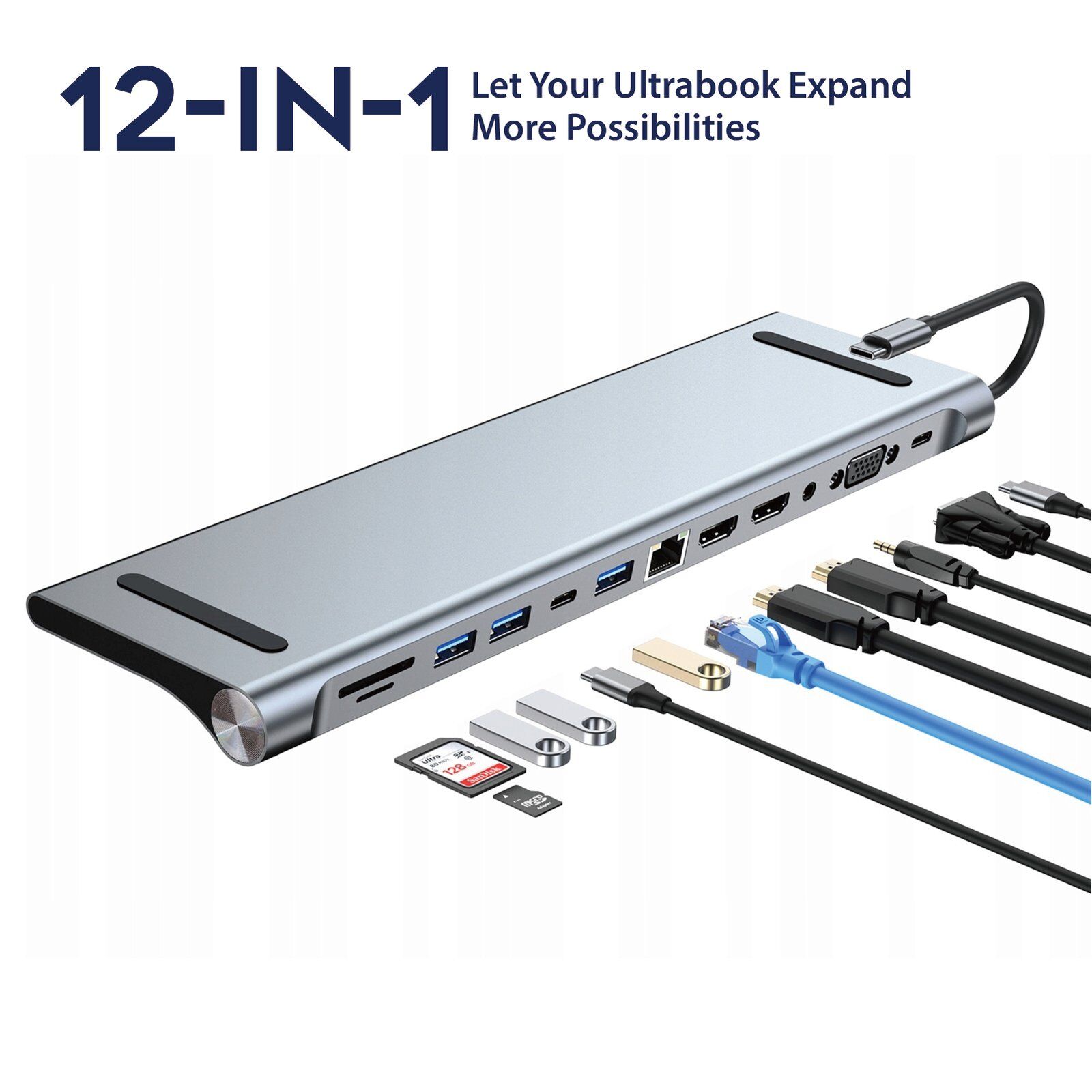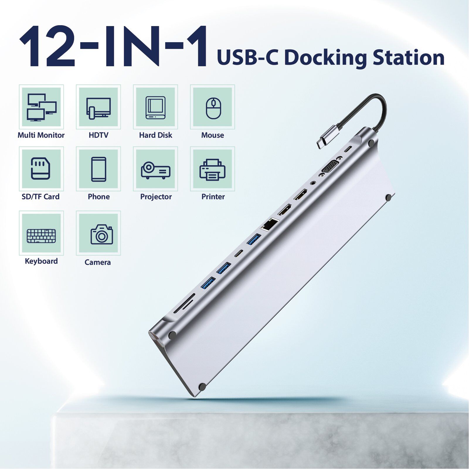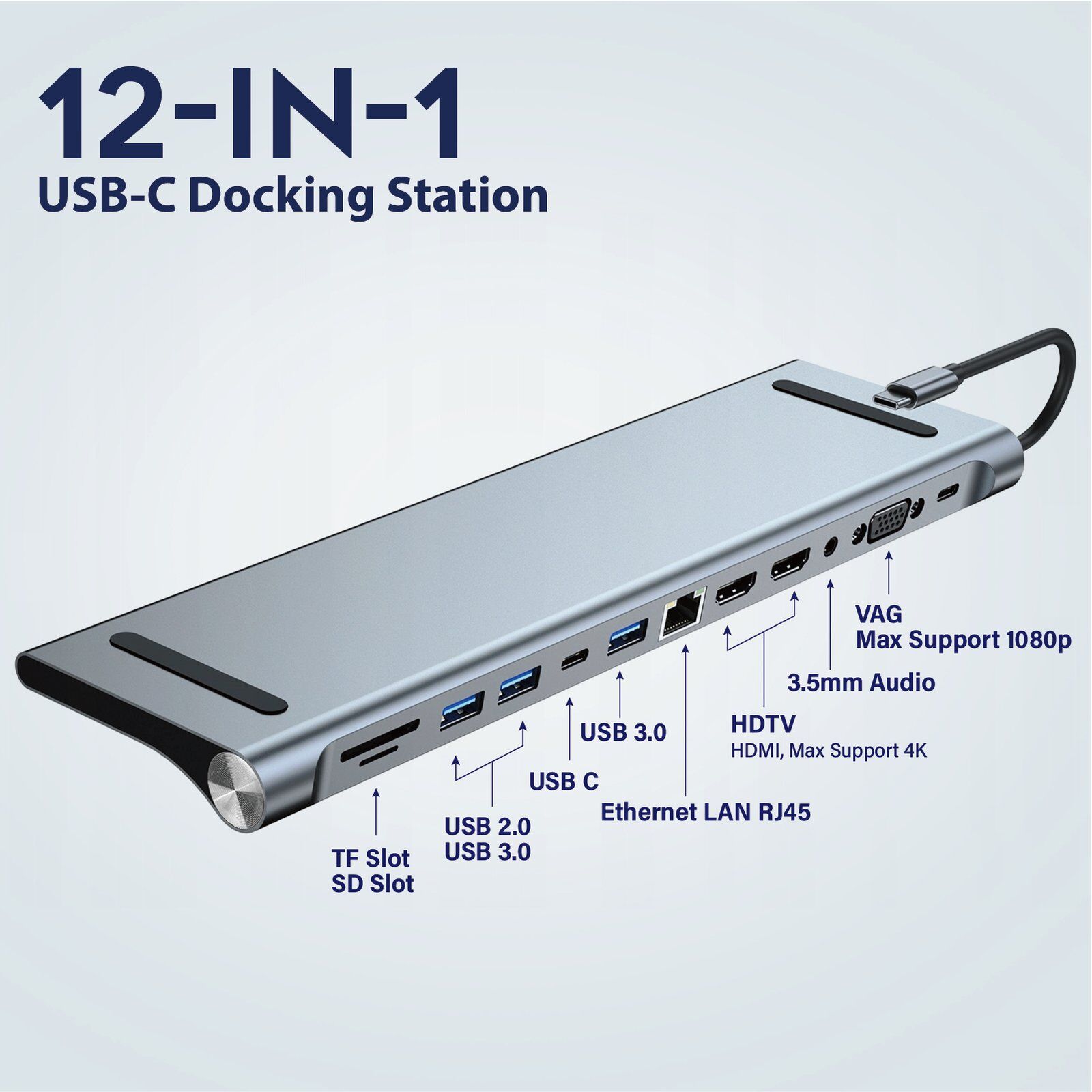 - 12-in-1 USB-C Docking Station: Expand your connectivity with 12 ports, including HDMI, VGA, USB 3.0, Ethernet, SD/TF card slots, and audio jack.