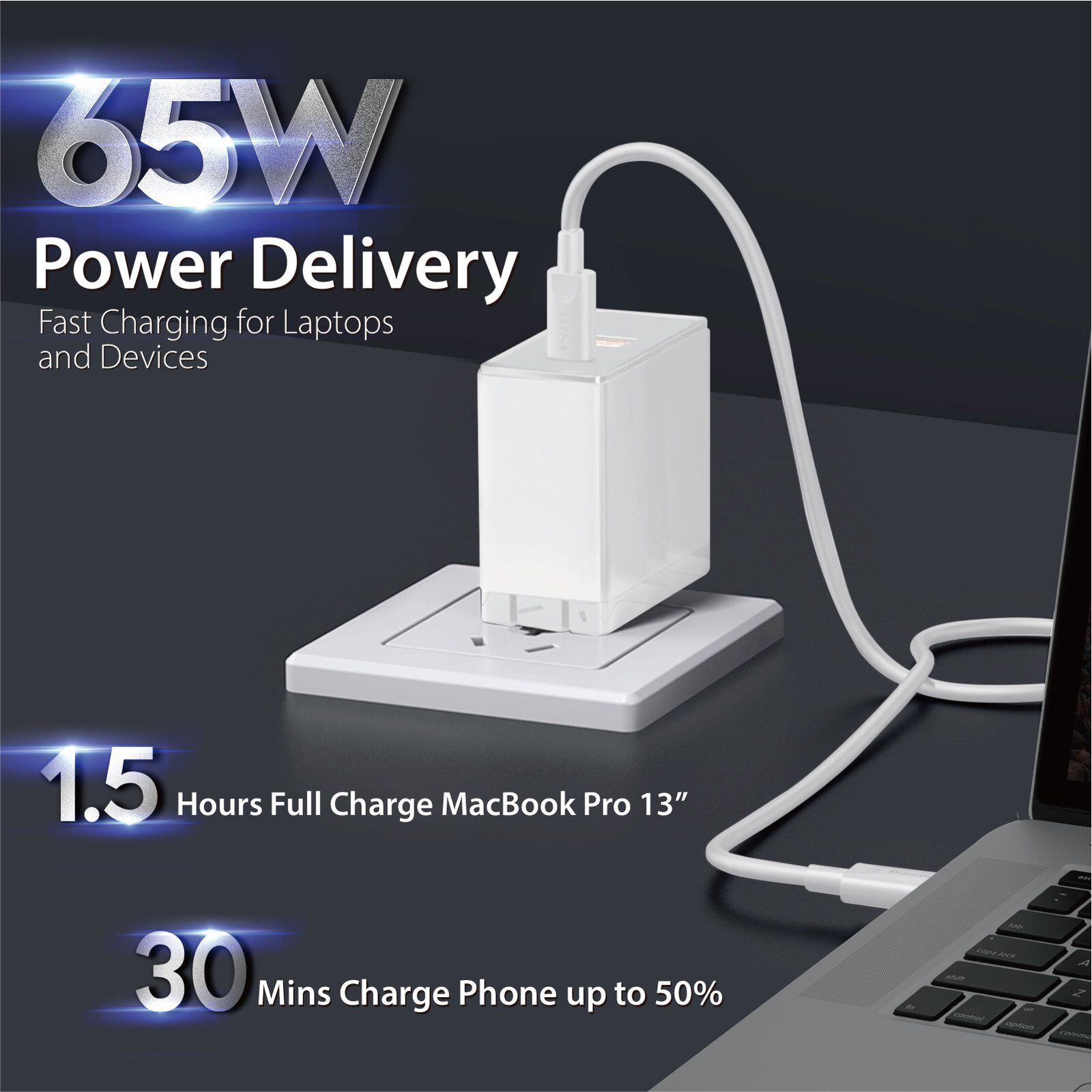 Powerful Charging: The 65W USB-C AC Adapter delivers fast and efficient charging, perfect for powering up your Chromebook/Macbook/Laptop quickly.