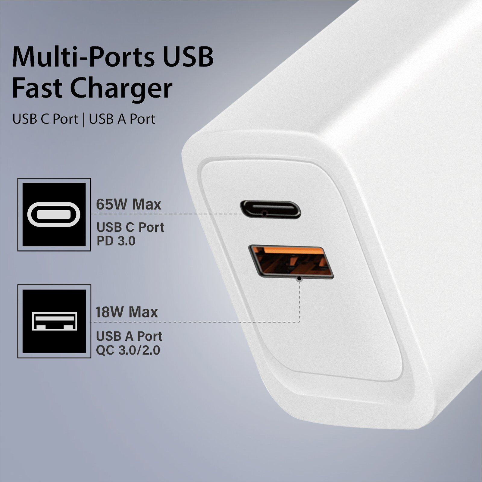 Dual-Port: Its dual USB-C and USB-A ports efficiently charge two devices simultaneously, delivering rapid, reliable energy. Embrace the future of charging—fast, flexible, and tailored for your tech.